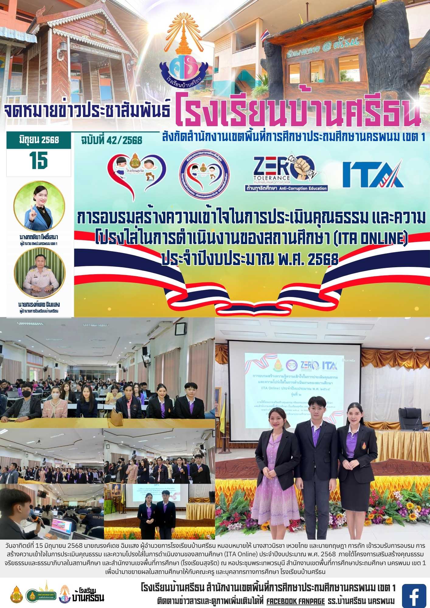 วันอาทิตย์ที่ 15 มิถุนายน 2568 นายณรงค์เดช ฉิมแสง ผู้อำนวยการโรงเรียนบ้านศรีธน หมอบหมายให้ นางสาวนิรชา เหวยไทย และนายกฤษฎา การถัก เข้ารวมรับการอบรม การสร้างความเข้าใจในการประเมินคุณธรรม และความโปรงใส่ในการดำเนินงานของสถานศึกษา (ITA Online) ประจำปีงบประมาณ พ.ศ. 2568 ภายใต้โครงการเสริมสร้างคุณธรรม จริยธรรมและธรรมาภิบาลในสถานศึกษา และสำนักงานเขจพื้นที่การศึกษา (โรงเรียนสุจริต) ณ หอประชุมพระเทพวรมุนี สำนักงานเขตพื้นที่การศึกษาประถมศึกษา นครพนม เขต 1 เพื่อนำมาขยายผลในสถานศึกษาให้กับคณะครู และบุคลากรทางการศึกษา โรงเรียนบ้านศรีธน |
